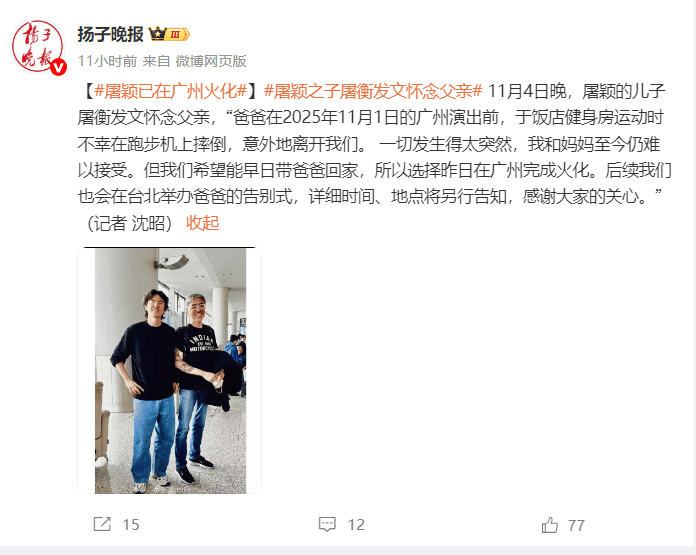 11月4日晚,屠颖的儿子屠衡发文怀念父亲,“爸爸在2025年11月1日的广州演出前,于饭店健身房运动时不幸在跑步机上摔倒,意外地离开我们。 一切发生得太突然,我和妈妈至今仍难以接受。但我们希望能早日带爸爸回家,所以选择昨日在广州完成火化。后续我们也会在台北举办爸爸的告别式,详细时间、地点将另行告知,感谢大家的关心。”