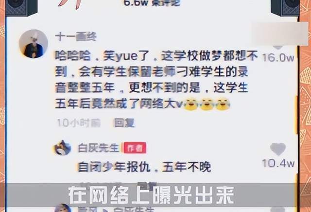 五年后,他成为百万粉丝网红,于是便将录音放出来,用网络的名义公审这位老师,在网友的集力下,他获得了成功,不但这位老师被开除,而且他也再度占据热搜。