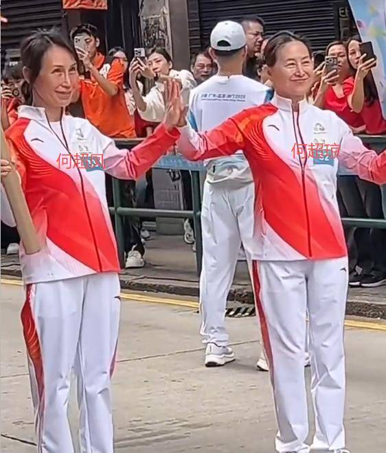 当何超琼跑完自己的路段,将火炬交给第33棒的何超凤时,姐妹俩默契地击掌,还相视一笑。