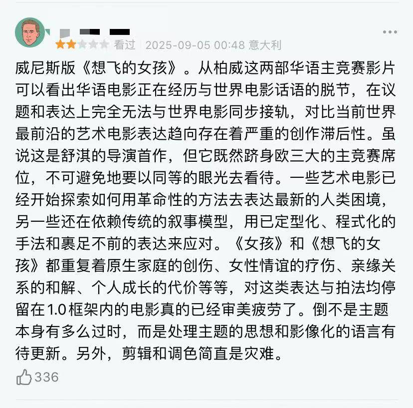 9月份的时候就已经有人看过,认为这部电影和《想飞的女孩》相比较,都是重复原生家庭的创伤,女性情谊的疗伤、亲缘关系的和解、个人成长的代价等,对这类表达与拍摄方法均停留在1.0框架内,审美疲劳了。处理主题的思想和影像化的语言有待更新,剪辑和调色简直是灾难。