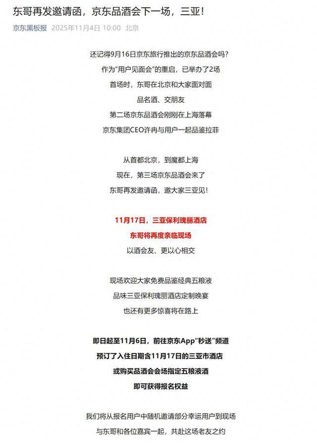 11 月 17 日,他将在三亚保利瑰丽酒店举办第三场 “京东品酒会”,亲自到场以酒会友,还邀请用户免费品鉴经典五粮液,现场还有定制晚宴。