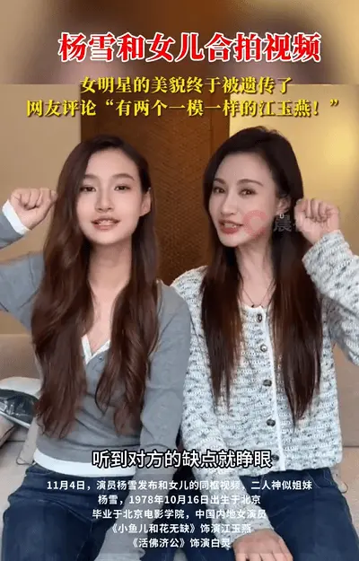 11月4日,演员杨雪在社交平台分享了一段与女儿的温馨同框视频。画面中母女二人容貌极为相似,宛若姐妹,引发网友热议。不少观众幽默评论道:“这简直是两个一模一样的江玉燕!&