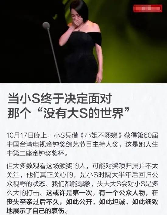 在金钟奖颁奖典礼上,小S卸下防备、拆掉伪装,以坦诚的方式,展示了自己的哀伤,她身上终于有了大S的影子。