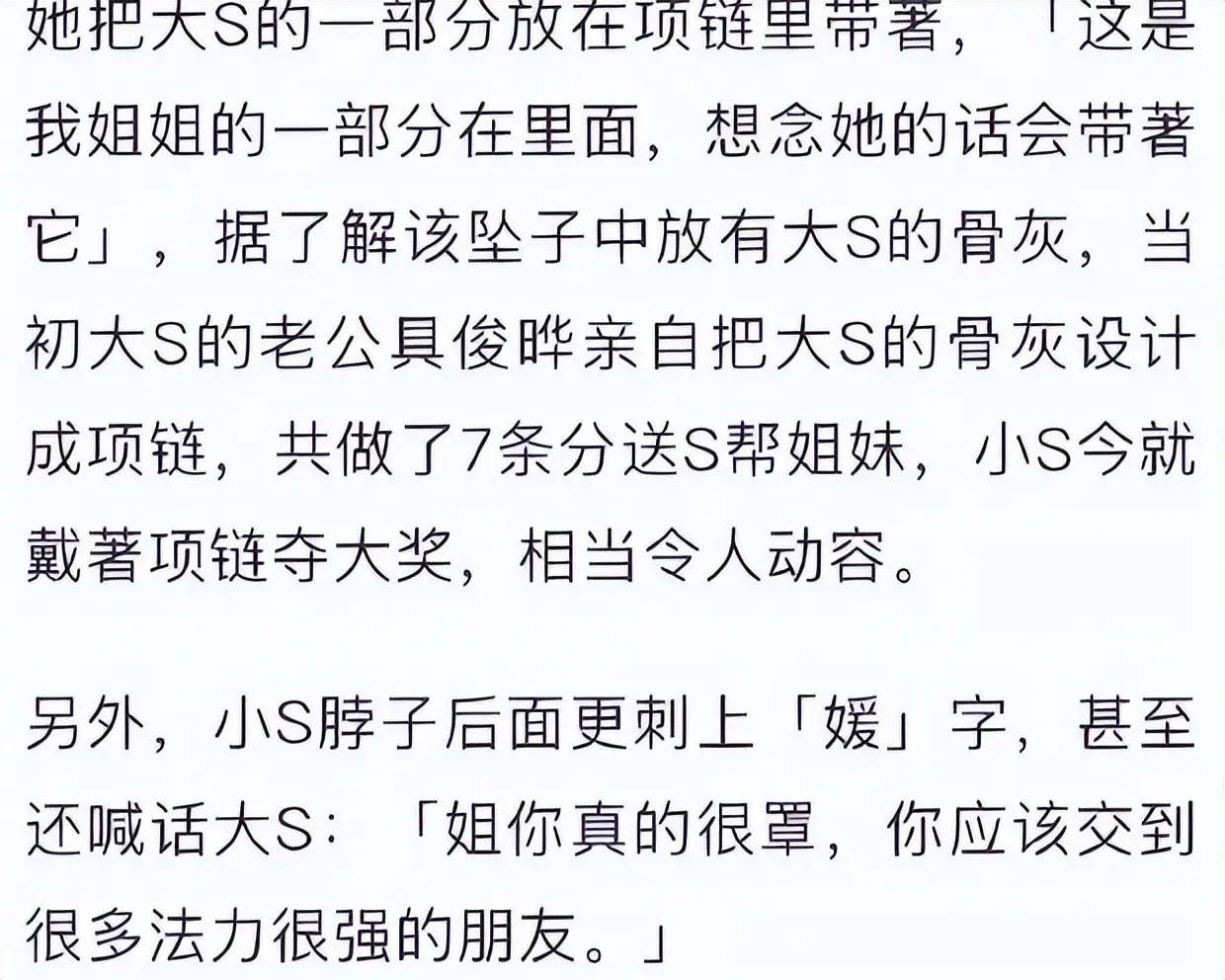 小S戴着大S骨灰做的黑色爱心项链,穿了一身黑色的长裙,整个人表现的很悲痛。大S走了,小S还想要带着姐姐一起生活。