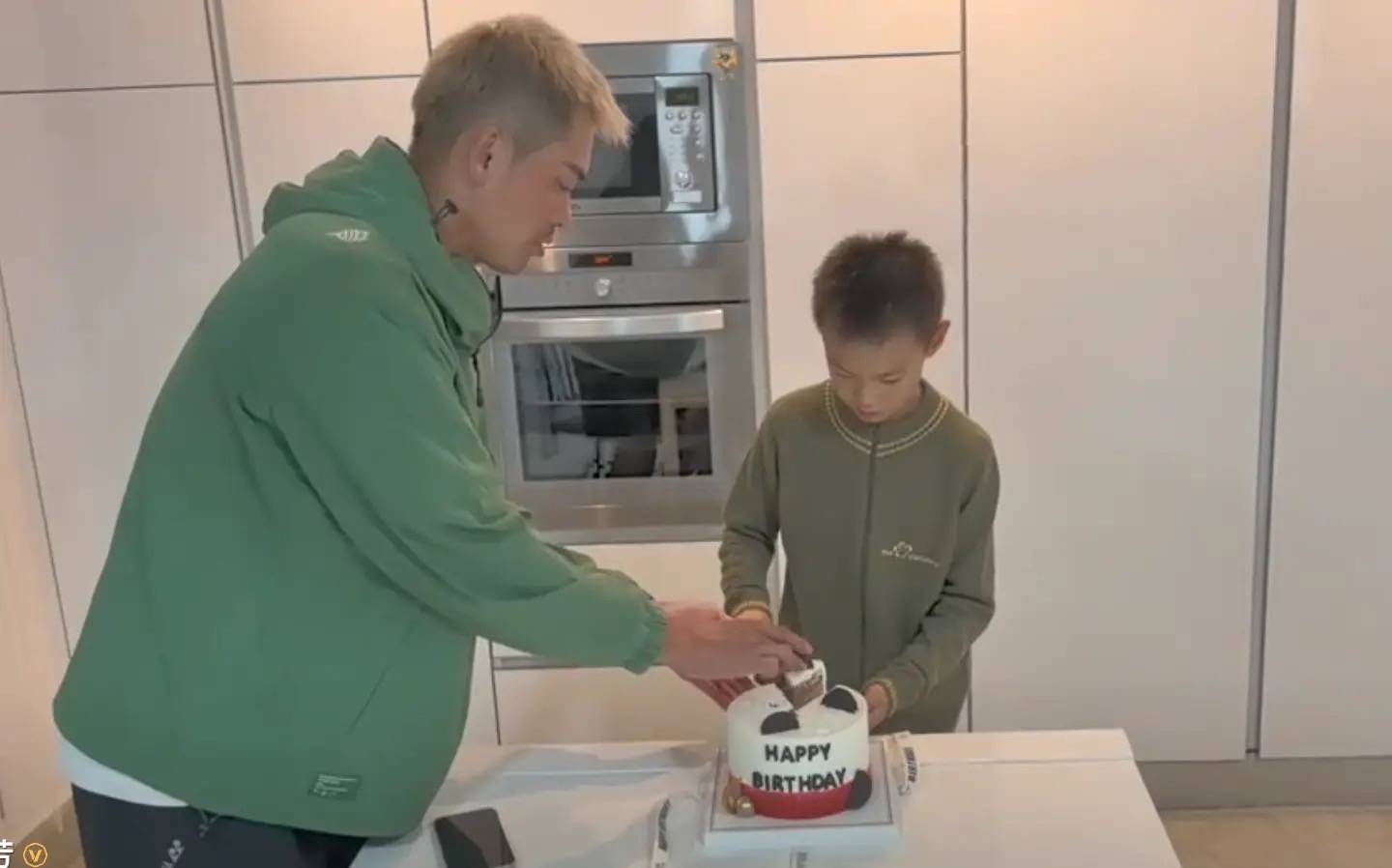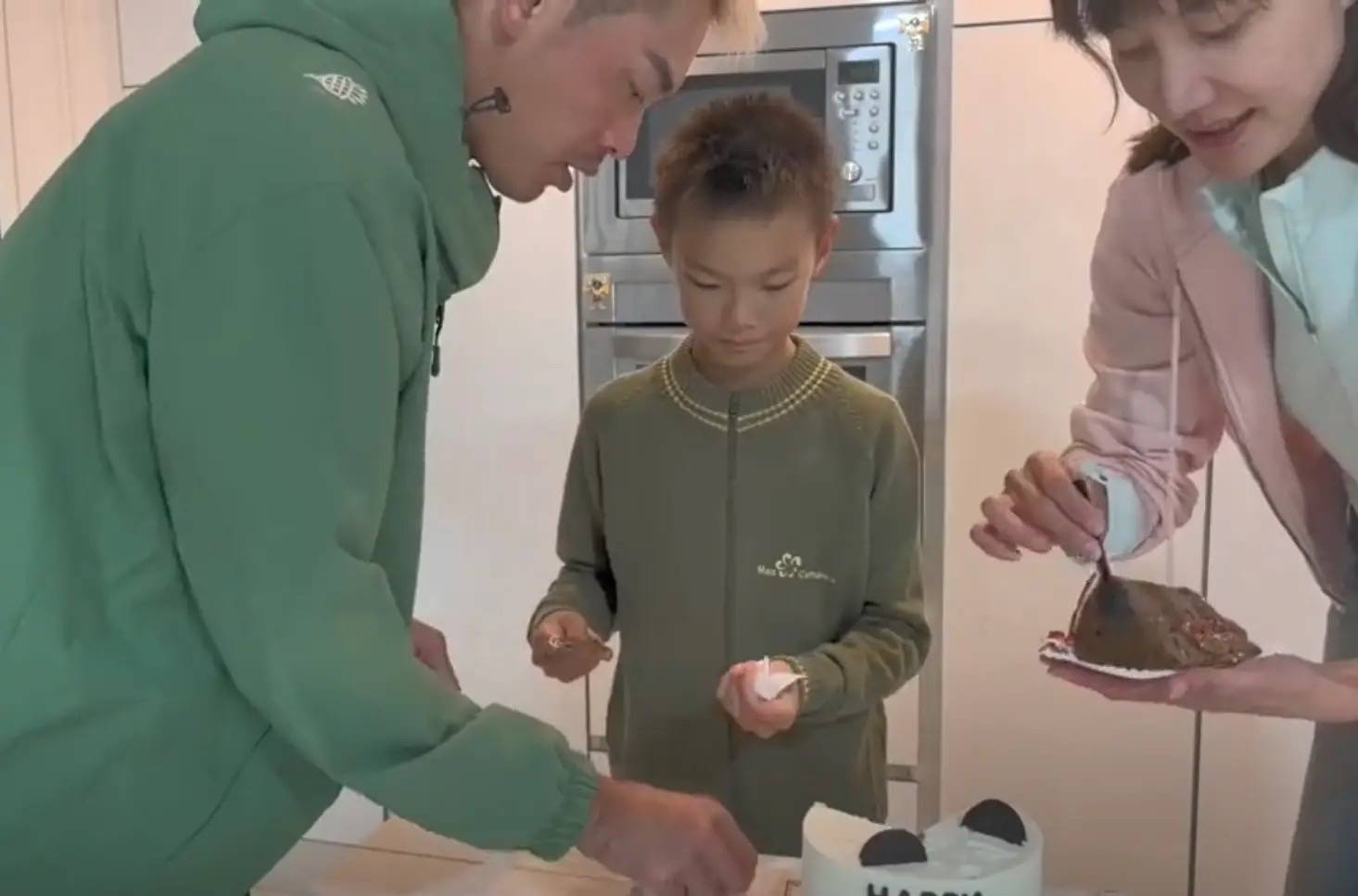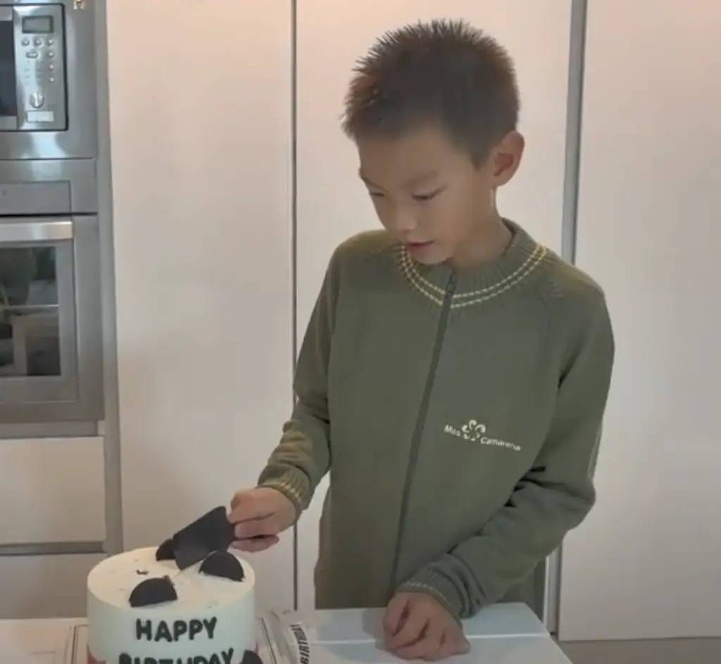 他们的儿子小羽才9岁的年纪,就已经在国外读书了。小羽切蛋糕的时候,非常有礼貌。可爱的卡通蛋糕,看着不大,刚好切成四份。