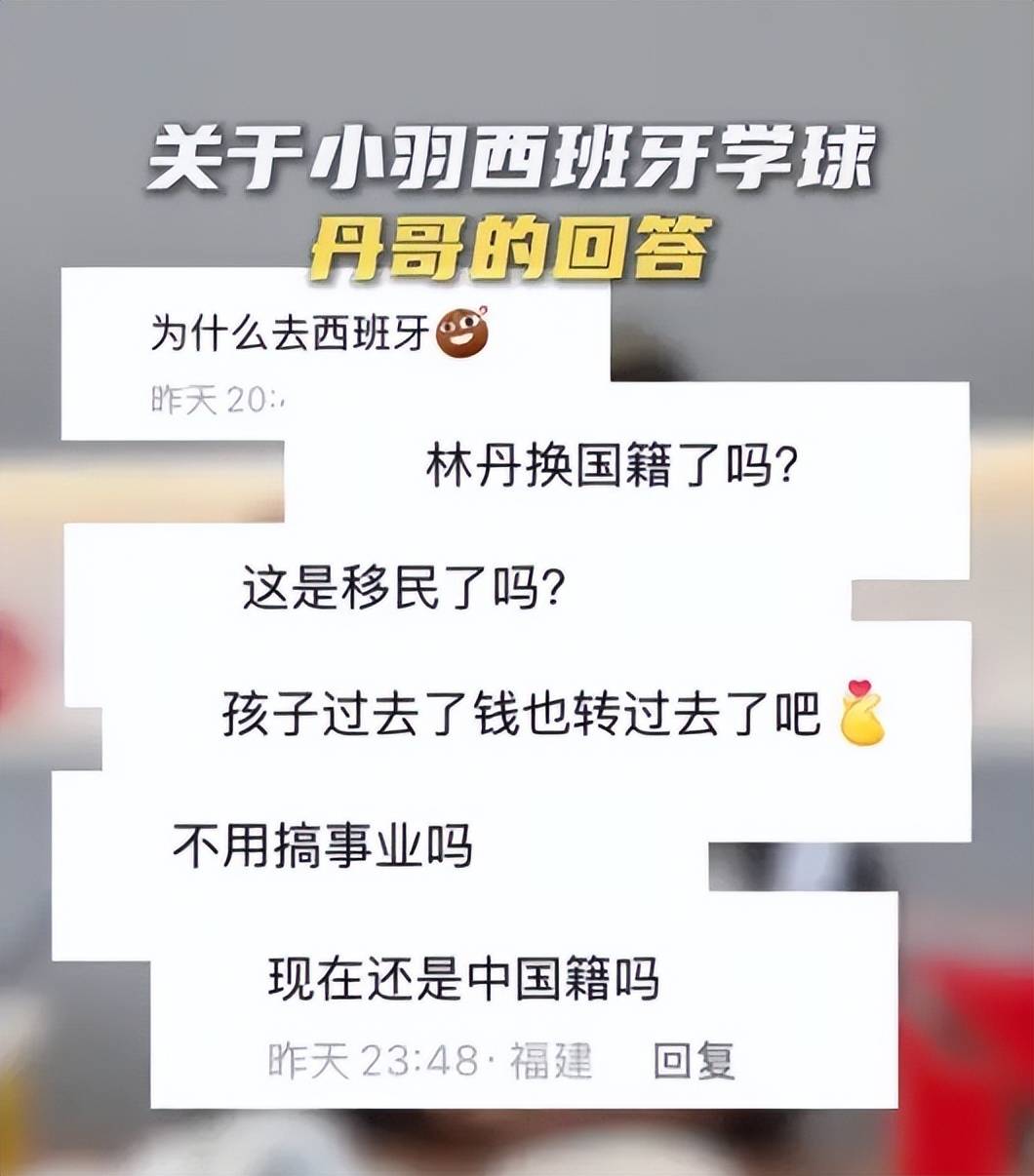 比如为什么是去西班牙?是不是移民了?孩子过去钱也转过去了吧!是不是换国籍了之类的,林丹也都给出明确答复。