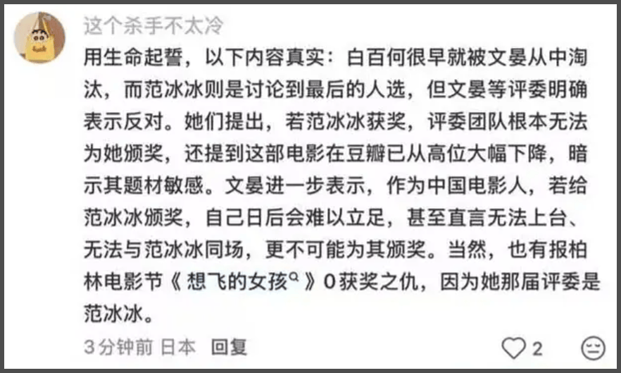 其实此前相关消息就已经泄露,电影《春树》是白百何一番主演,电影节有两位华语评委文晏和桂纶镁,因此都看好白百何,结果传出沪圈要求文晏撕奖给“镶边男主”王传君,如今也算坐实了该爆料,也难怪王传君表示的很平静了,应该是知道了结果。