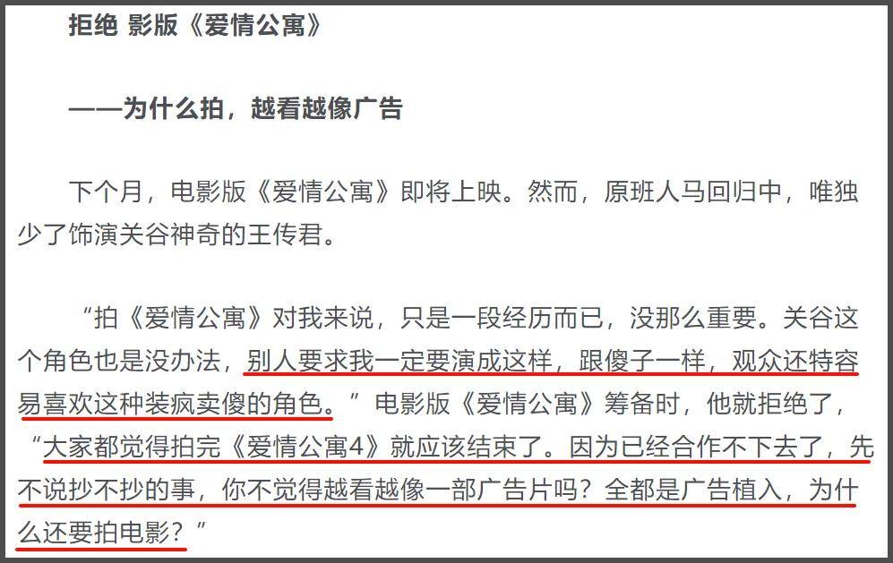 但王传君对《爱情公寓》这部剧的看法并不是很好,在采访中说“关谷神奇”这个角色是别人要求他演得跟傻子一样,并拒绝再出演《爱5》,吐槽《爱情公寓》就是一部广告片,全是广告植入。