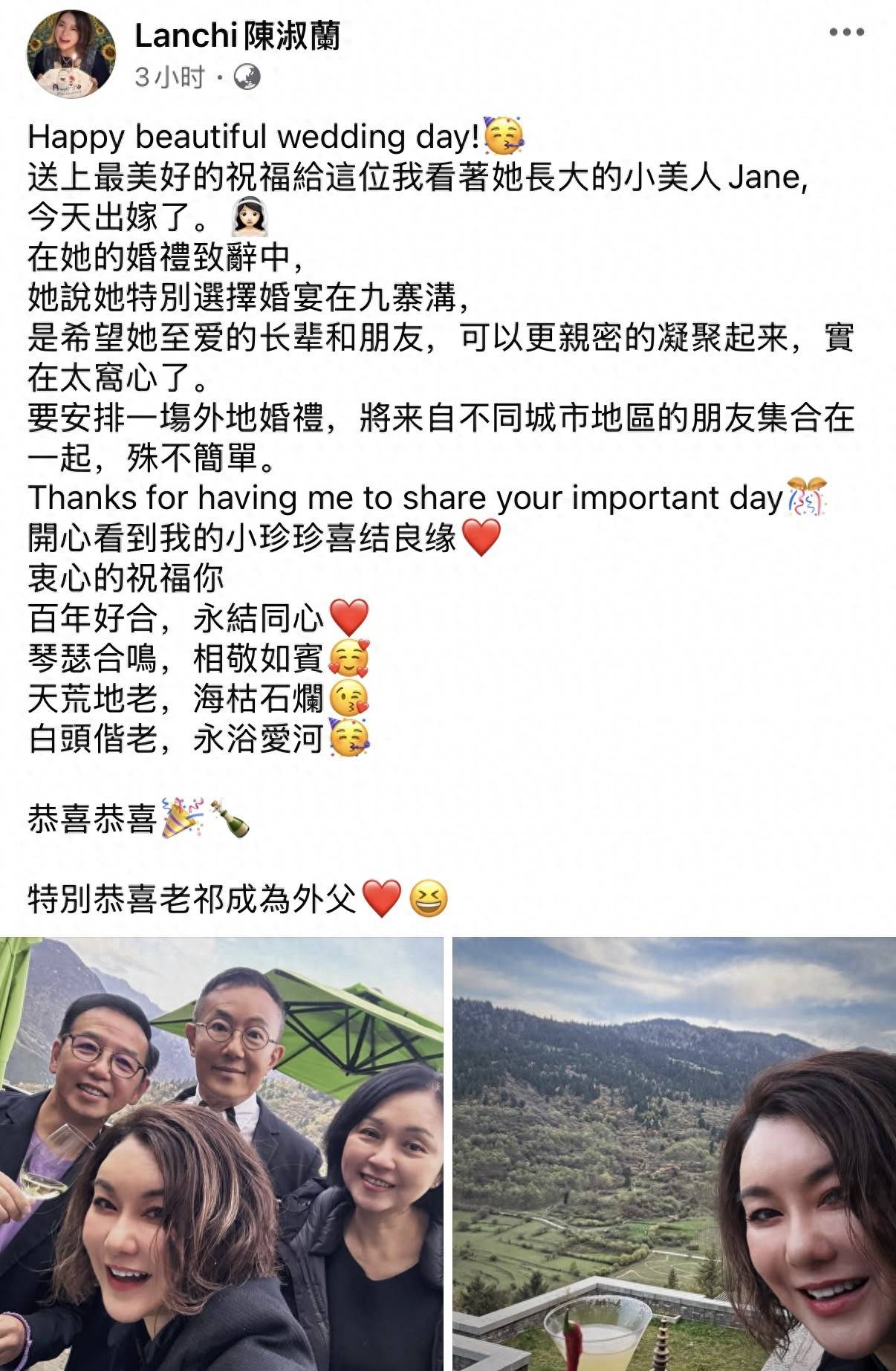 陈淑兰早前就已经预告祁文杰要嫁女,不过当时没有透露婚宴的详情,原来祁文杰的女儿的婚宴是在九寨沟举办。陈淑兰称这是祁文杰的女儿专门挑选的地点,就是希望至爱她的长辈与朋友可以更亲密地凝聚起来,将来自不同城市地区的朋友集合在一起。陈淑兰自称是看着祁文杰的女儿长大的,顾名思义,就是把对方当作女儿看待,如今祁文杰嫁女,就等于是自己嫁女,她心情激动且美丽。