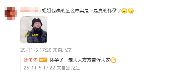 5日,有网友在徐冬冬评论区带图猜测道:“姐姐包裹的这么厚实是不是真的怀孕了?”对于网友的疑问,徐冬冬马上回应称:“怀孕了一定大大方方告诉大家。”