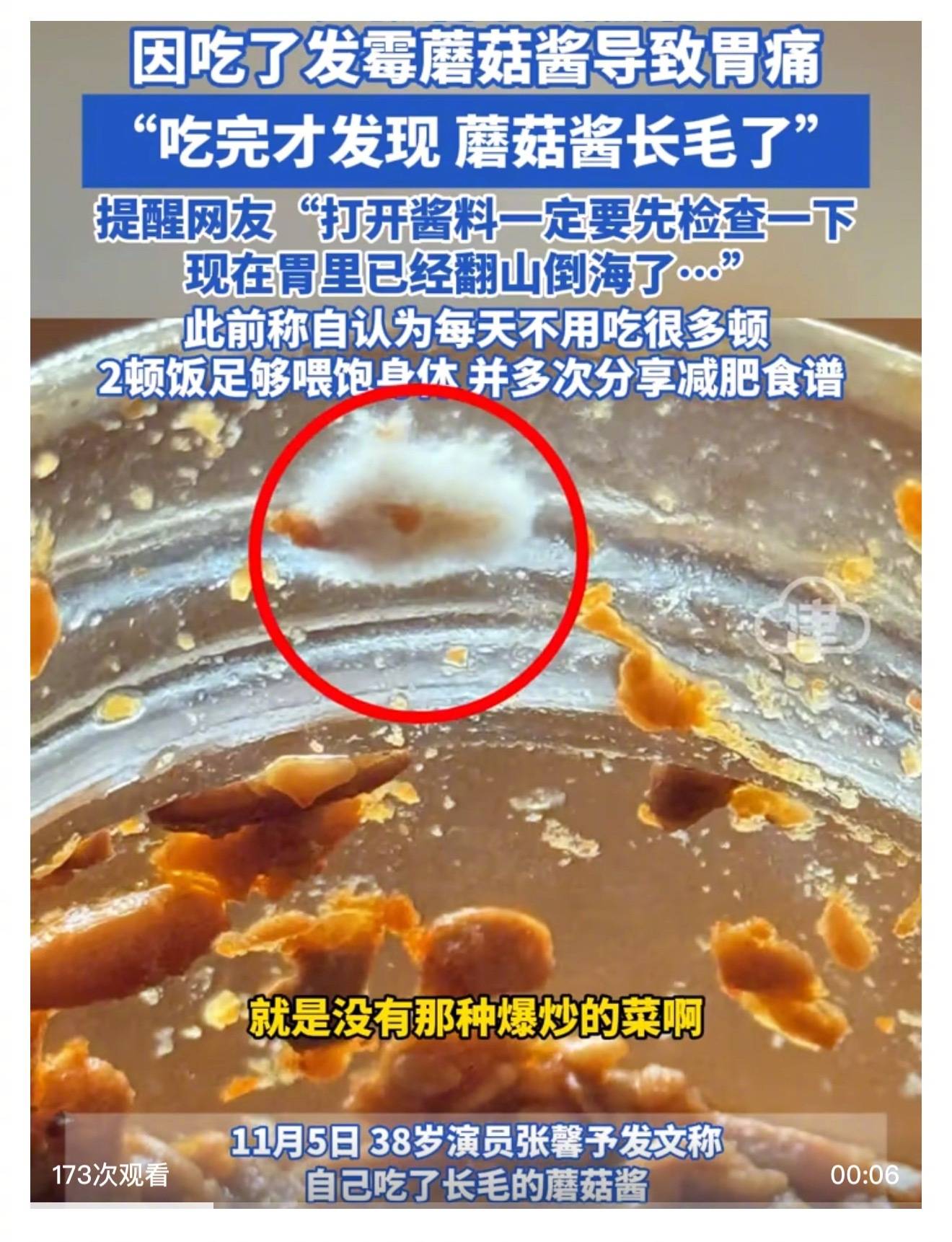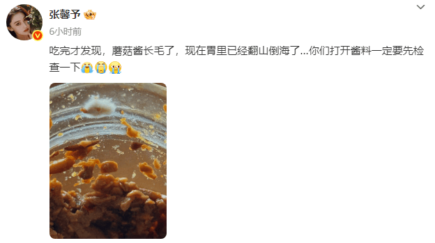 此前,张馨予发文透露自己误食了长毛的蘑菇酱,并提醒大家在吃酱料前一定要先检查一下。