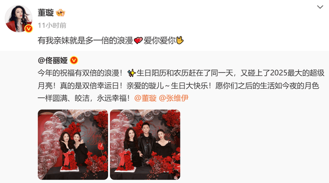 佟丽娅晒出与董璇合照为其庆生,并祝福董璇与张维伊永远幸福。合照中,张维伊也有出镜,并未缺席老婆生日宴。