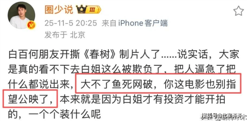 白百何的好友们也纷纷站出来为她发声。一位名为 “圈少说” 的百万粉丝大 V 放出疑似白百何好友朋友圈截图,指责《春树》制片人彭瑾追着白百何 “吸血” ,把她当垫脚石,还爆料《春树》是因为白百何才有投资能开拍 。这位大 V 更是火力全开,放话 “大不了鱼死网破,你这电影也别指望公映了” ,言辞激烈,将事件推向了更高潮。
