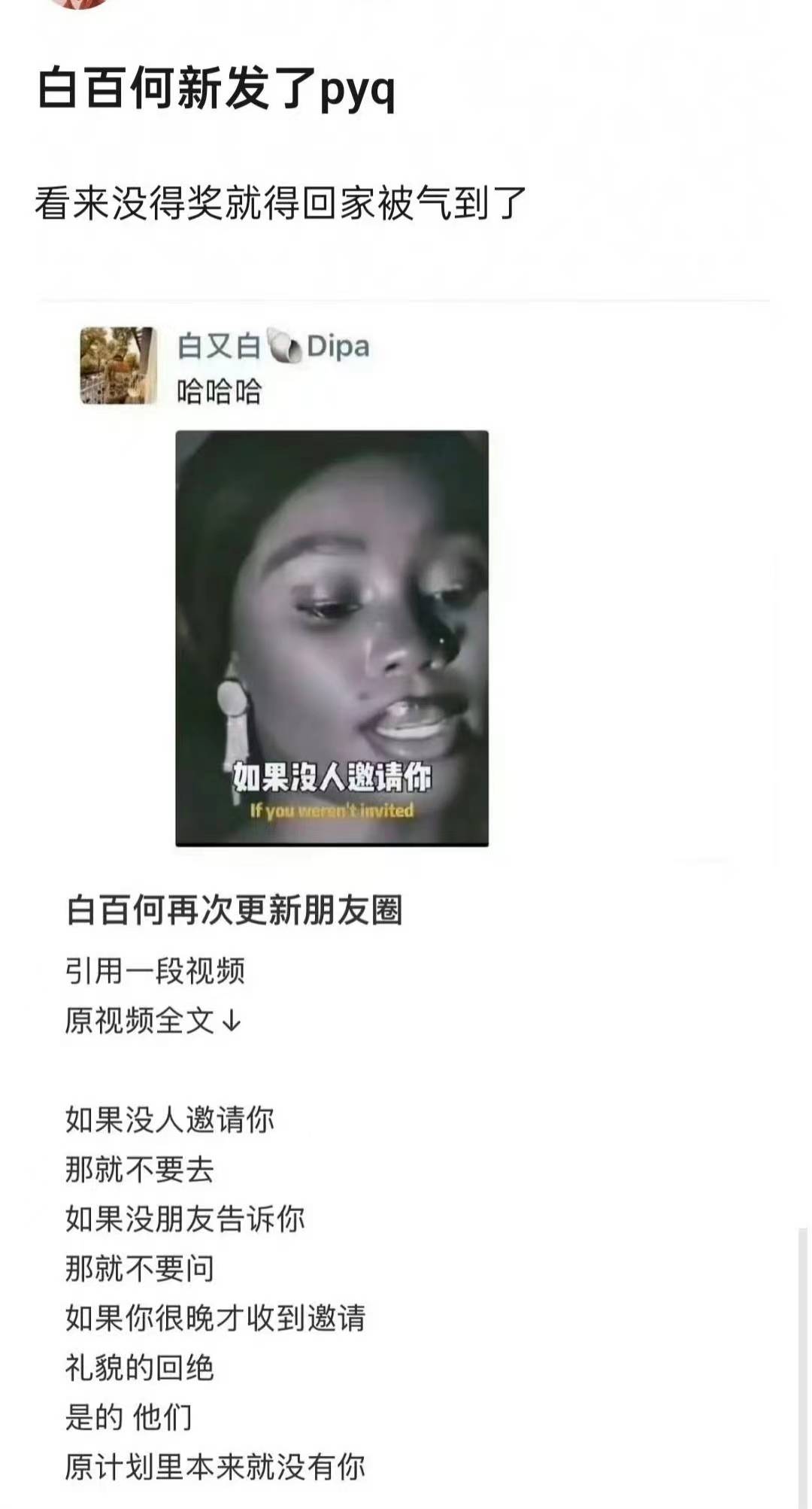 白百何更新的朋友圈是一段外籍女歌手的说唱,大概意思是如果没人邀请你,那就不要去,如果没朋友告诉你,那就不要问,如果你很晚才收到邀请,礼貌的回绝,是的,他们,原计划里本来就没有你。