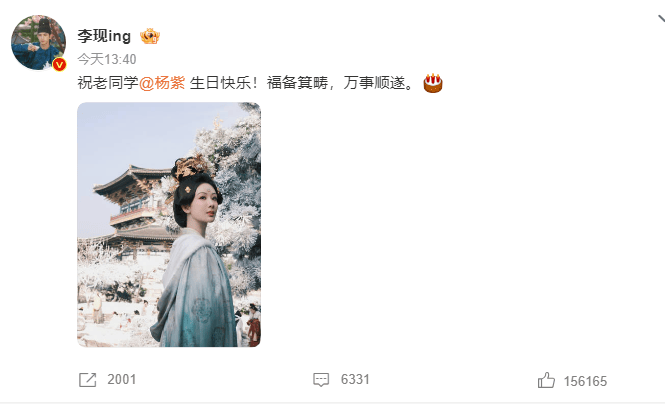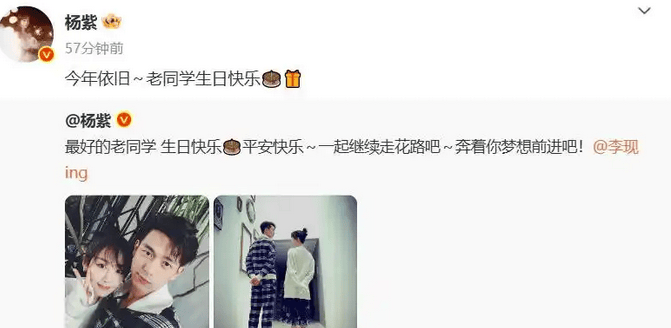 11月6日正值杨紫33岁生日,好友李现发文为她庆生,他写道:“祝老同学杨紫生日快乐!福备箕畴,万事顺遂。”