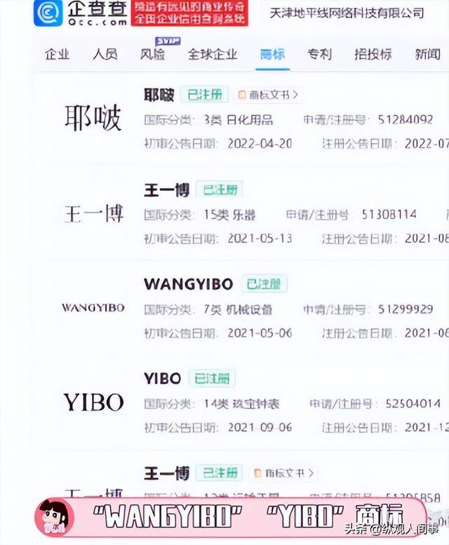持股70%的天津地平线公司,从2023年就开始注册"王一博""耶啵""WANGYIBO"商标,国际分类从日化用品到珠宝钟表全包了,现在已经有17个商标注册成功。