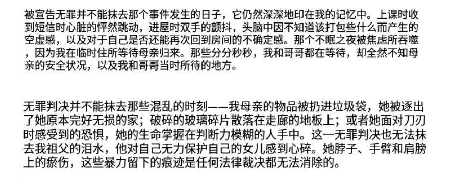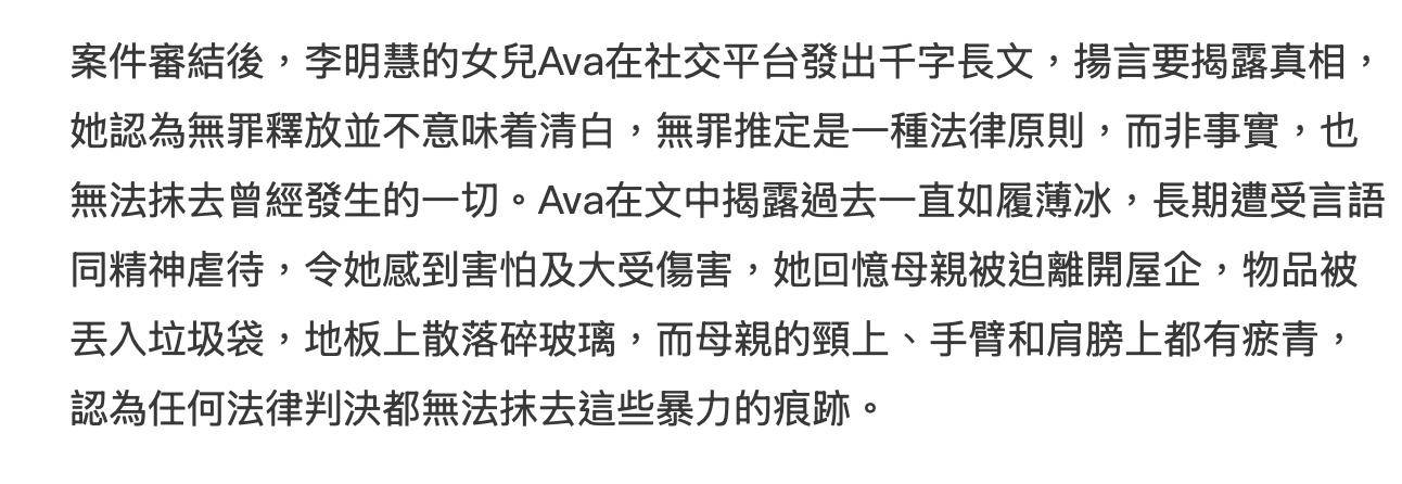 而李明慧公开被家暴后,她18岁的女儿在社交平台上以英文写下了千字长文,直接控诉父亲陈燿阳。李明慧的女儿在文章中表示父亲虽然被法院宣布无罪,但并不意味着无辜,更称事实的真相并非是法院所裁定的,而父亲无罪也不能抹去那些年,对自己,对兄长,对母亲的暴力。她称陈燿阳的语言暴力给自己留下了伤痛,让自己失去了价值感与认同感,更自曝每次收到父亲的短信,都会心跳加速,而每次回家都会双手颤抖,继而变得焦虑、甚至失眠。