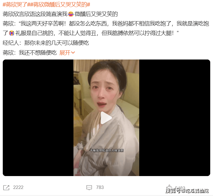视频里,蒋欣穿着家居服,素面朝天,拿着纸巾不停地擦拭眼泪,双眼通红。她吐露心声:“我这两天好辛苦啊!都没怎么吃东西,我爸妈都不相信我吃饱了,我就是演吃饱了……”原来,为了穿上精心挑选的礼服,蒋欣不得不严格控制饮食。她还自嘲“礼服是自己挑的,不能让人觉得丑,但我胳膊依然可以拧得过大腿”。蒋欣一直是圈内出名的“吃货”,但易胖体质和较大的骨架,让她为了保持身材得付出比别人更多的努力。