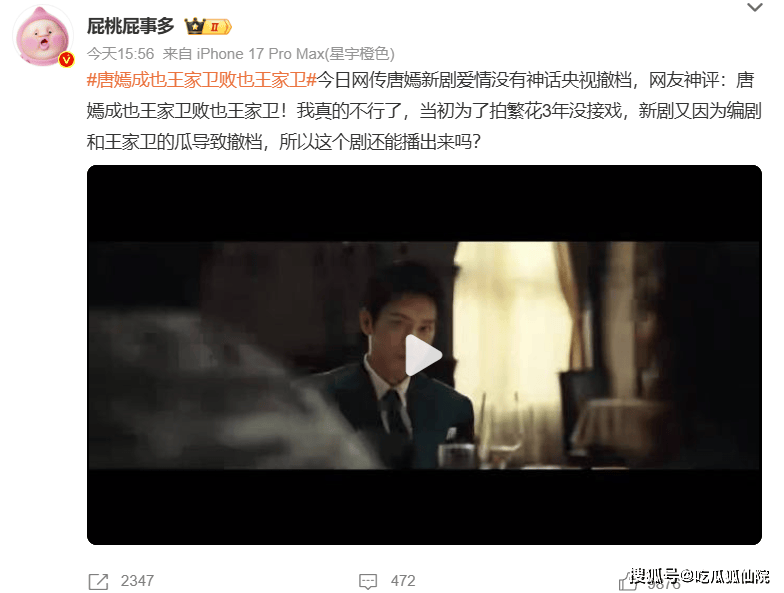然而,“败也王家卫”的阴影也随之而来。王家卫团队的一些负面事件接连发生,私下录音的曝光,其中包含对唐嫣“很装”的评价,还涉及对其他演员的争议言论。尽管有信息证实这可能是对创作细节的误读或角色与演员的混淆,但负面讨论仍持续发酵,公众将其与唐嫣早年“迟到”旧闻关联,她的公众形象受到了冲击。此外,编剧秦雯的丑闻及特权言论引发抵制,导致唐嫣主演的《爱情没有神话》被央视撤档,这对她的事业发展造成了不小的打击。