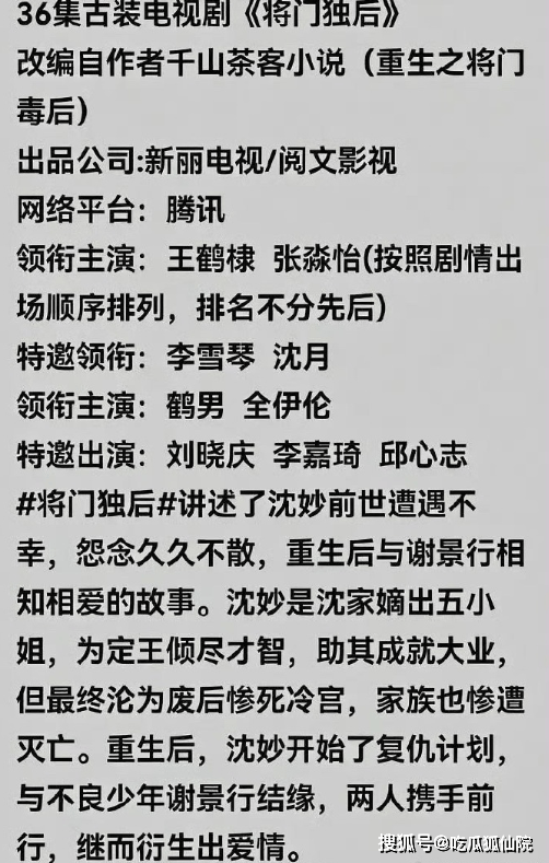 《将门毒后》的网传演员阵容可谓是五花八门,不过截至目前,所有的阵容都还未得到官方确认。究竟哪些演员会最终出演,让我们拭目以待。
