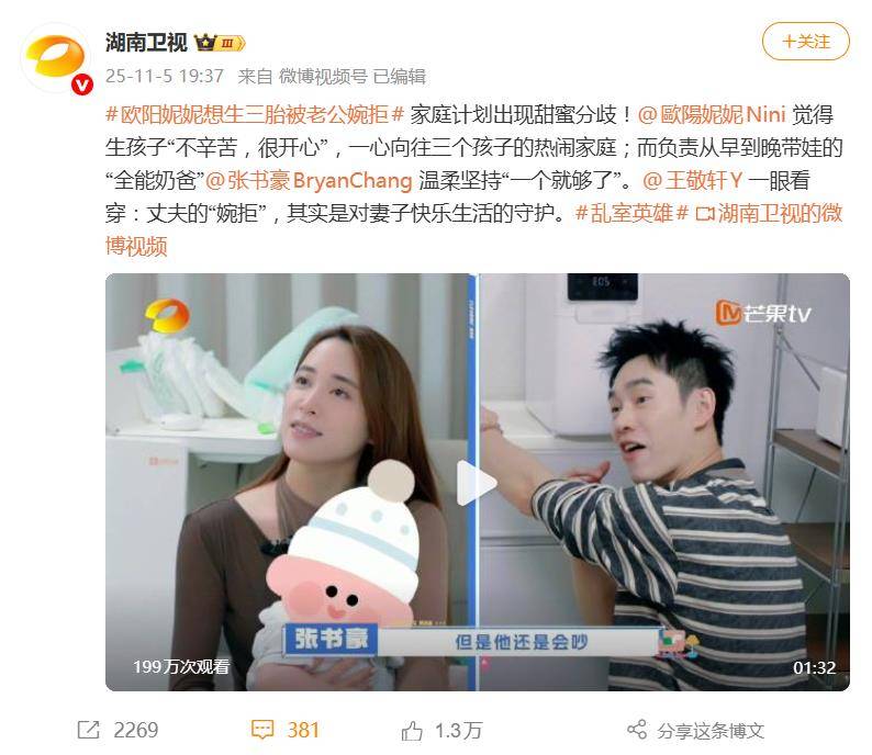 欧阳妮妮在育儿中扮演着“情绪陪伴者”角色,自称是孩子的“陪玩姐姐”。首胎的顺利体验让她对生育充满乐观,而妹妹欧阳娜娜等家人带来的手足温情,更让她坚信“孩子多是福”。然而,丈夫张书豪的日常却是另一番画风——作为家庭育儿的主力,他从喂养哄睡、清洁消毒到全天陪护亲力亲为,甚至因长期带娃导致“手机长时间无法使用”。他坦言育儿日常“连正常吃饭都需争分夺秒”,带一个娃已耗尽精力,多胎计划实在力不从心。