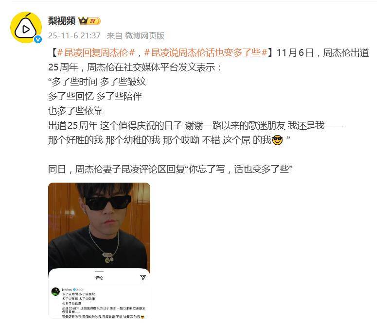 11月6日,周杰伦一篇为纪念出道25周年发布的感性长文,瞬间点燃了全网粉丝的青春回忆。然而,真正让话题冲上热搜榜的,却是妻子昆凌在评论区的一句神来之笔的调侃:“你忘了写,话也变多了些”。