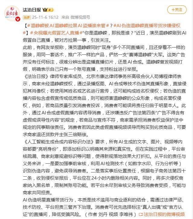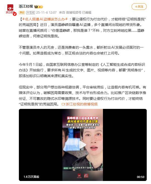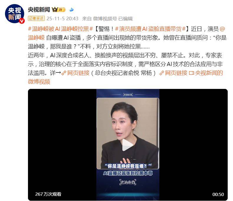 深夜刷短视频,却刷到好几个“自己”在直播间里卖力吆喝——这魔幻的一幕,最近让演员温峥嵘撞了个正着。她发现多个直播间同时盗用其形象进行AI带货,从颈膜到面霜,商品五花八门。气不过的温峥嵘亲自下场质问“你是温峥嵘,那我是谁?”,结果竟被对方光速拉黑。这一遭遇,瞬间将AI盗播乱象推上了风口浪尖。