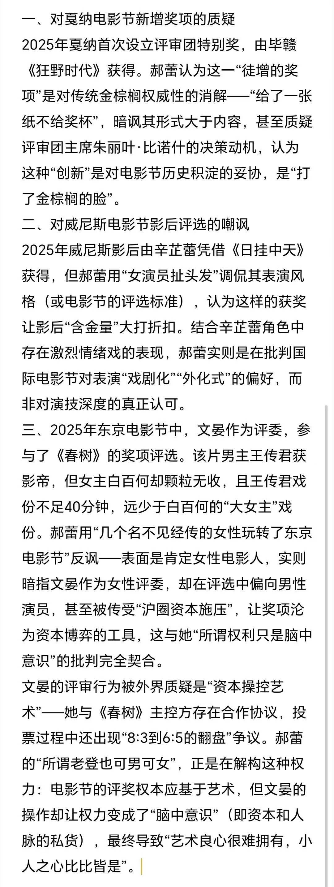 文晏的评审行为被外界质疑是“资本操控艺术”,暗示她与《春树》主控方存在合作协议,投票过程还出现了8:3到6:5的翻盘争议。郝蕾指的“所谓老登也可男可女”,正是在解构这种权力,电影节的评奖权本应基于艺术,但文晏的操作却让权力变成了“脑中意识”(即资本和人脉的私货),最终导致“艺术良心很难拥有,小人之心比比皆是”。