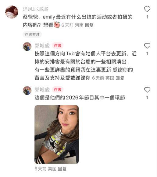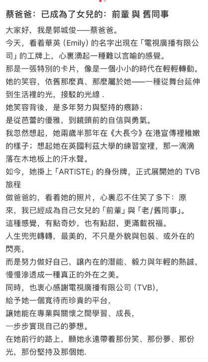 近日,其父郭城俊在社交网发文,宣布女儿已正式加入TVB成为旗下艺人。他写道:“看着华英的名字出现在‘电视广播有限公司’的工牌上,心里涌起一种难以言喻的感觉。那是一张特别的卡片,仿佛一个小小的时代在轻轻转动。她的笑容,依旧那么真挚、那么属于她,一种从舞台延伸到生活里的光,一脉相承的光。她笑容背后,是多年努力与坚持的痕迹;是从芭蕾的优雅,到镜头前的自信与勇气。我忽然想起,她两岁半那年在《大长今》香港宣传活动中稚嫩的模样;想起她在英国利兹大学的练习室里,那一滴滴落在木地板上的汗水声。”