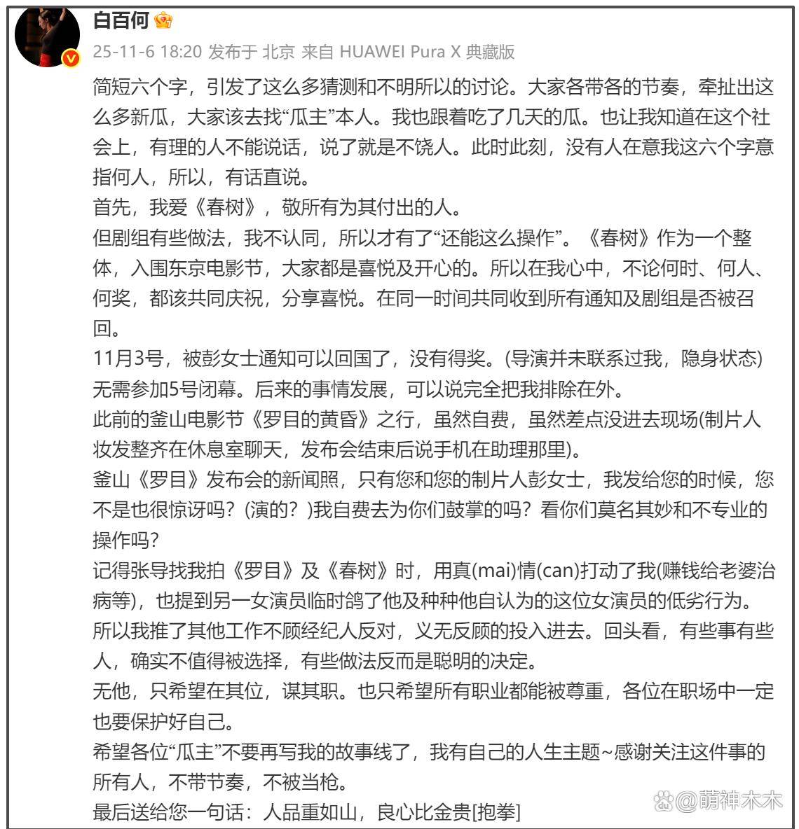 由白百何发文引发的舆论风波进一步升级,她本人终于发声,还原了矛盾的起因,并直指《春树》导演张津和制片人彭瑾,对她进行孤立和排挤。