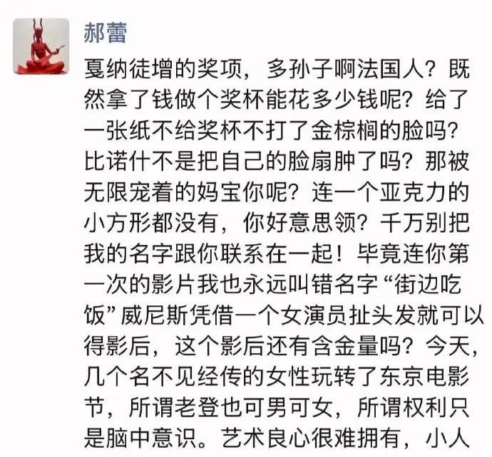此前,网上一张疑似是郝蕾朋友圈截图引发热议,其中写道“威尼斯凭借一个女演员扯头发就可以得影后,这个影后还有含金量吗?”