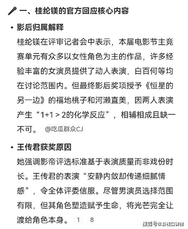 对于网友们铺天盖地的质疑,桂纶镁在评审记者会采访时表示,本次主竞赛单元有非常多以女性角色为主的作品,所以女演员竞争非常激烈。很多优秀的女演员包括白百何都在讨论范围内。但福地桃子和河濑直美有非常好的化学反应,两人缺一不可,相辅相成。所以一同成为了第38届东京电影节的双黄蛋影后。