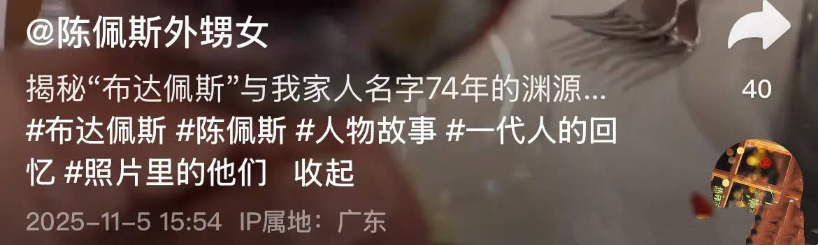 11月5日,陈佩斯的外甥女也发布了一条视频动态。揭秘了“布达佩斯”与家人名字74年的渊源。陈佩斯是家中老二,大哥是陈布达、三妹是陈丽达。
