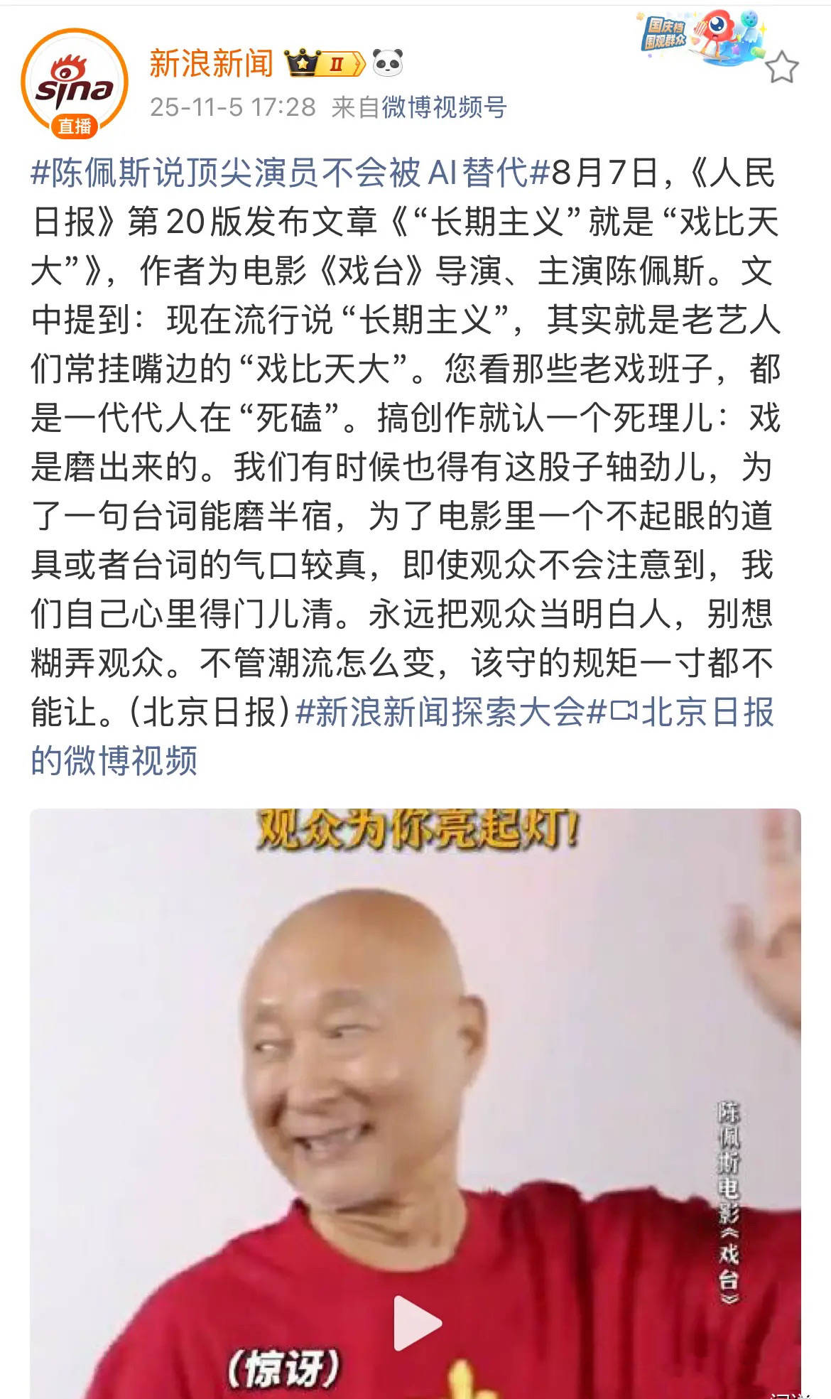 老一辈的演员,身上有一种“韧劲”。他们愿意和每一个角色“死磕”,为了一句台词打磨到深夜,为了呈现出好的作品废寝忘食。当演员与AI的话题被陈佩斯送上