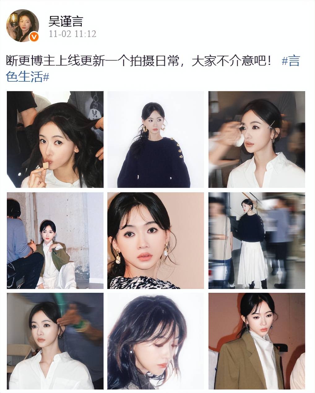 吴谨言如今也成为了实力派的演员,在11月2日吴谨言在自己的社交平台上晒出了一组美照,还配文:断更博主上线更新一个拍摄日常,大家不介意吧?照片中的吴谨言真是越长越美了,作为90后的女演员,完全看不出35岁的年纪。