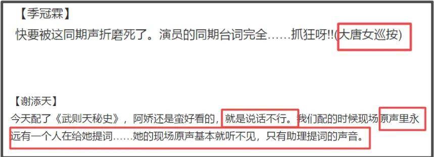 考古季冠霖、谢添天以前的抱怨,发现就是指名道姓,尤其是谢添天的吐槽,该配音点名配的是《武则天秘史》,表示阿娇好看但说话不行,而且配的时候现场声里永远都有一个人在帮忙提词。