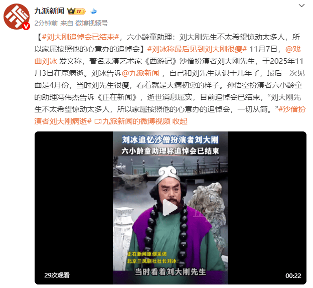 11月7日,戏曲演员刘冰发文称,著名表演艺术家《西游记》沙僧扮演者刘大刚先生,于2025年11月3日在京病逝。刘冰告诉九派新闻,自己和刘先生认识十几年了,最后一次见面是4月份,当时刘先生很瘦,看着就是大病初愈的样子。