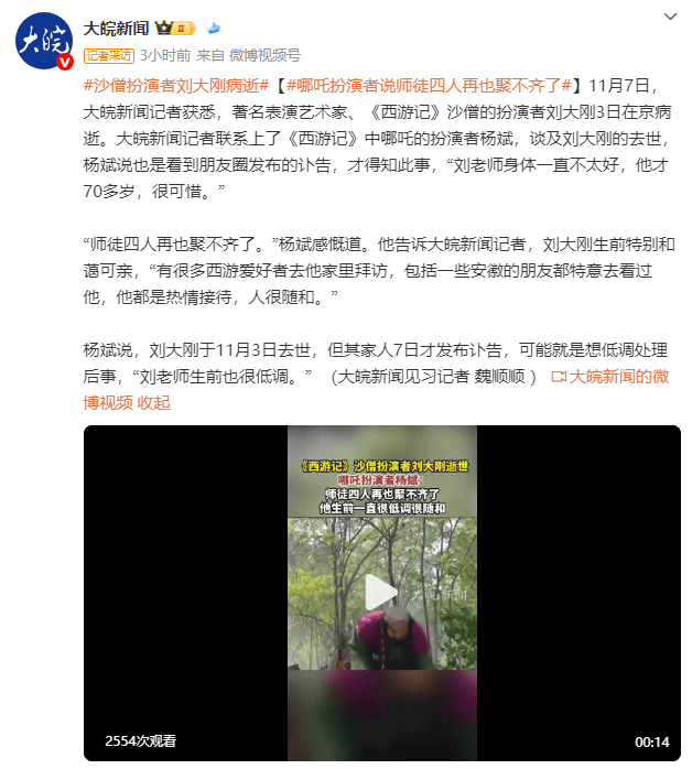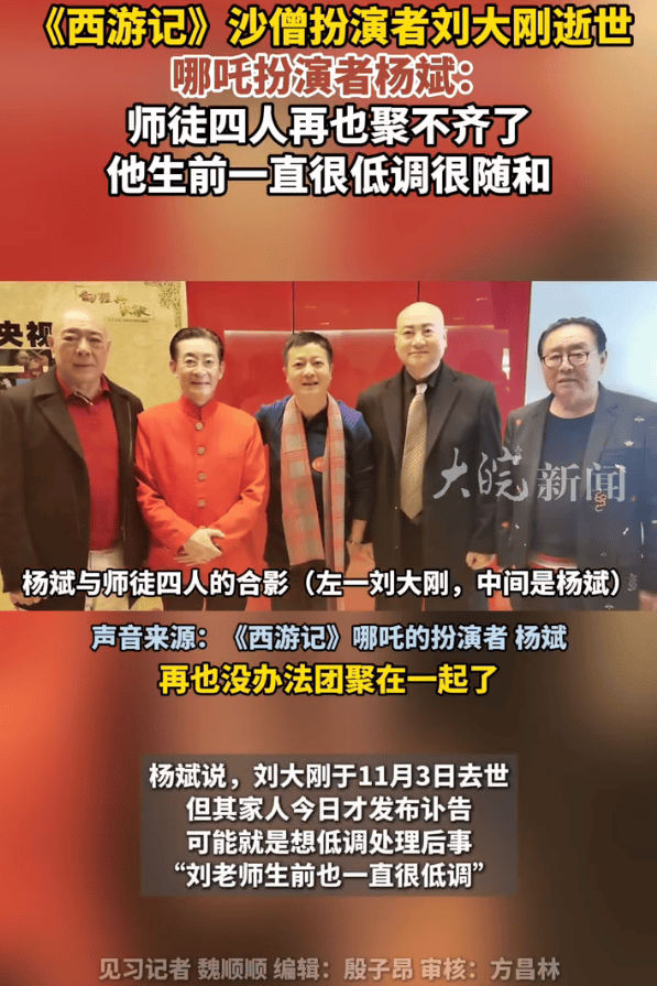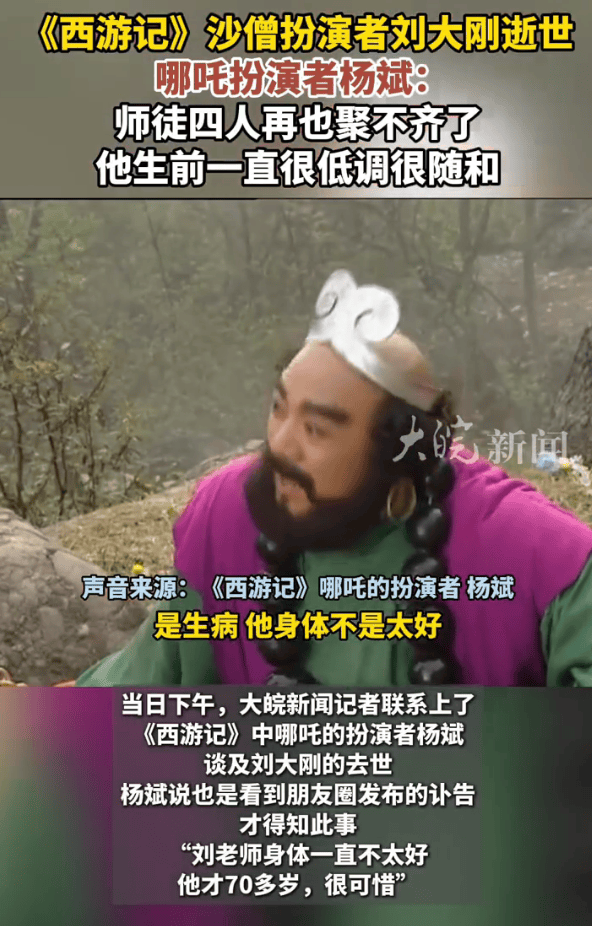 (来源:大皖新闻)11月7日,大皖新闻记者获悉,著名表演艺术家、《西游记》沙僧的扮演者刘大刚3日在京病逝。大皖新闻记者联系上了《西游记》中哪吒的扮演者杨斌,谈及刘大刚的去世,杨