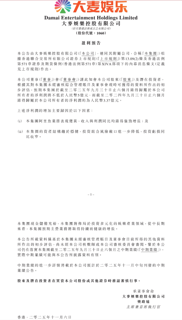11月6日,在港股上市的大麦娱乐(原阿里影业)发布业绩增长预告,预计截至2025年9月30日止六个月录得归属于公司所有者的净利润将不低于人民币5亿元,而截至2024年9月30日止六个月录