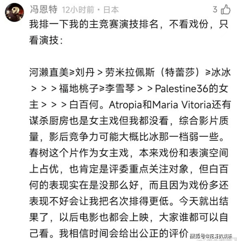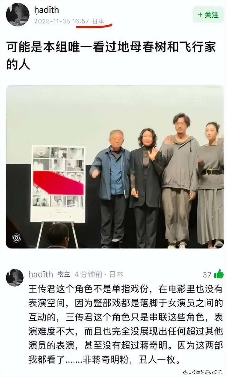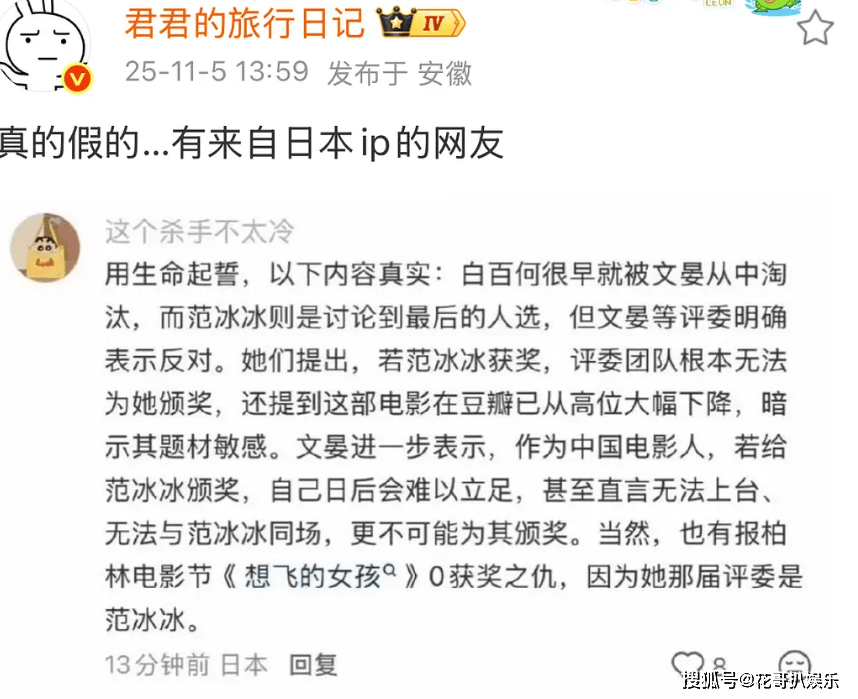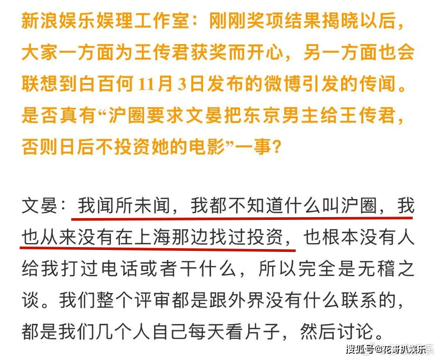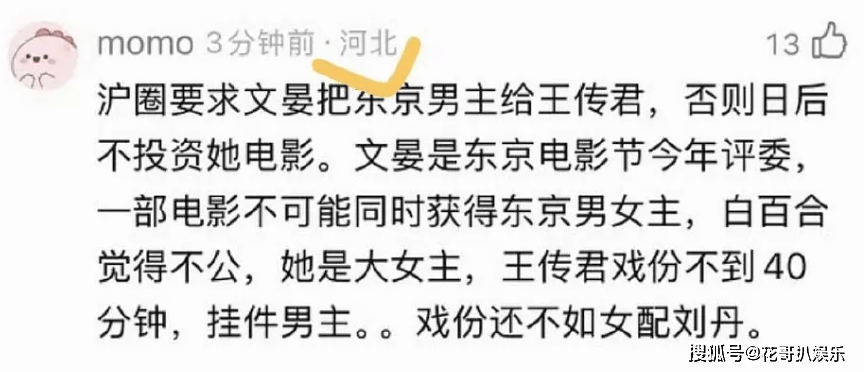 一位IP地址是河北的网友突然发文,说沪圈要求本届东京电影节的中国评委文晏暗中操作,力保王传君拿影帝,不然她以后的电影就别想得到投资了。