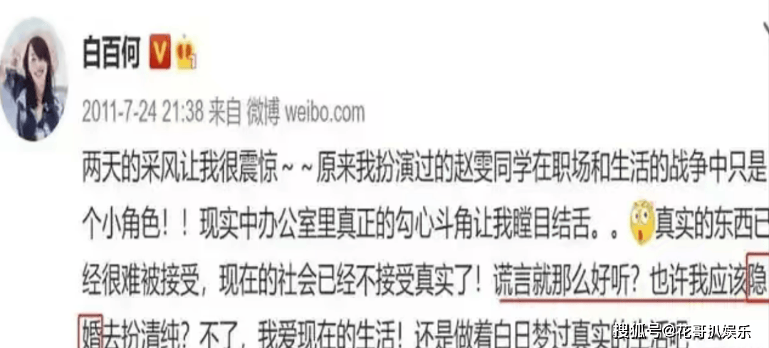 没多久,白百何就曝光高露隐婚生子,还假装不小心说出来的。她这边装无辜无所谓,重点是毁了高露的上升路。