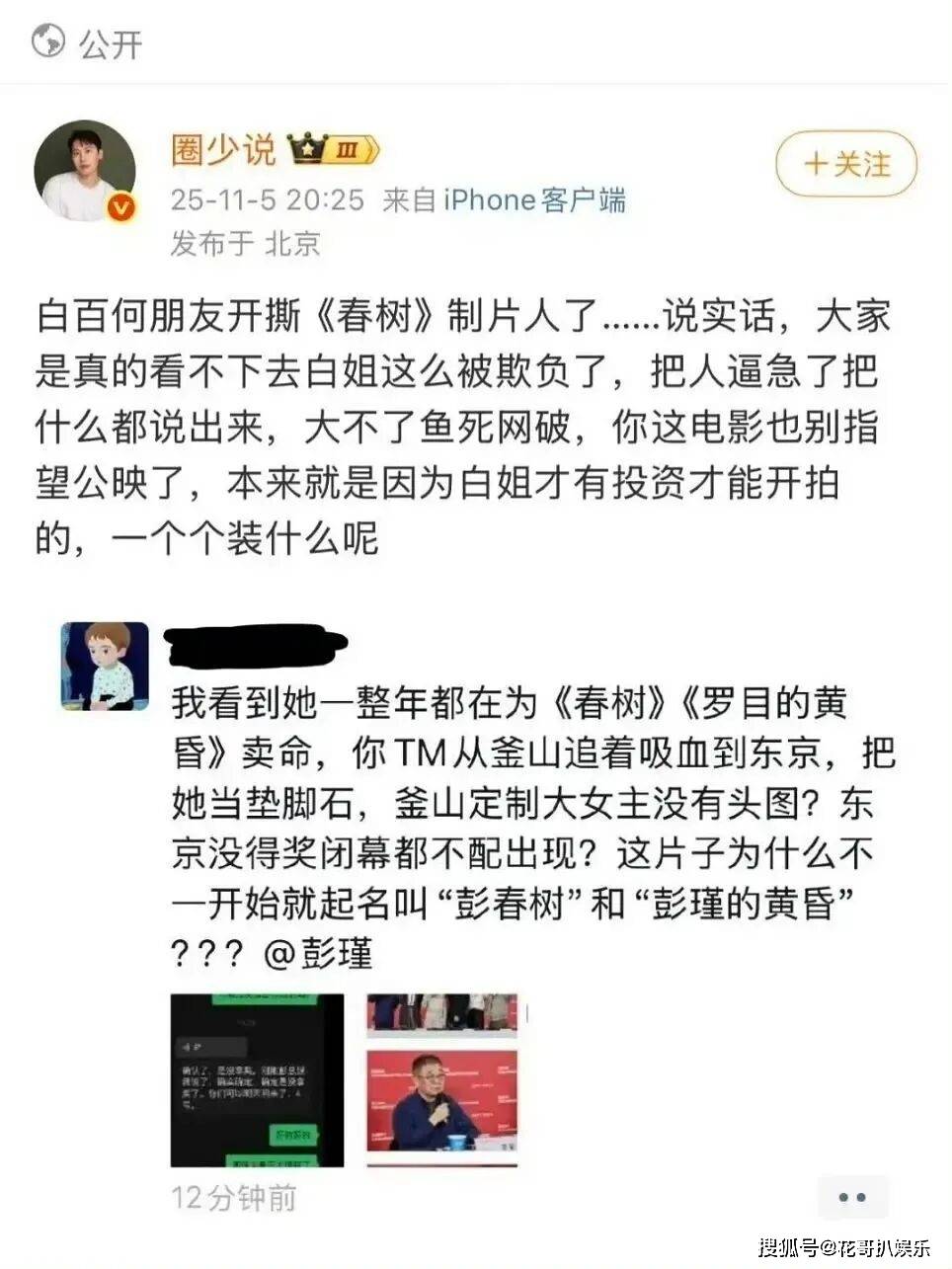 白百何的朋友也在朋友圈里面开撕《春树》的制作人,骂他们全剧组都拿白百何当垫脚石,当初明明靠着白百何的大名拉投资,但现在却翻脸不认人,电影节闭幕式都不让她参加。