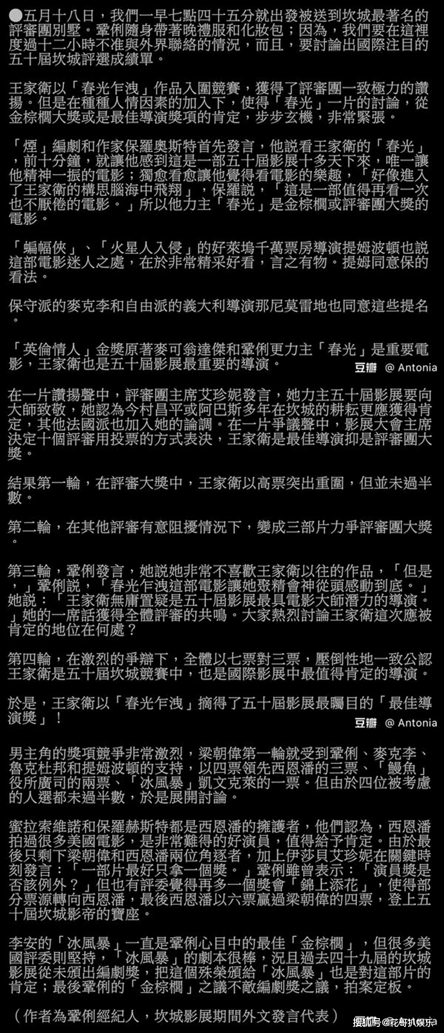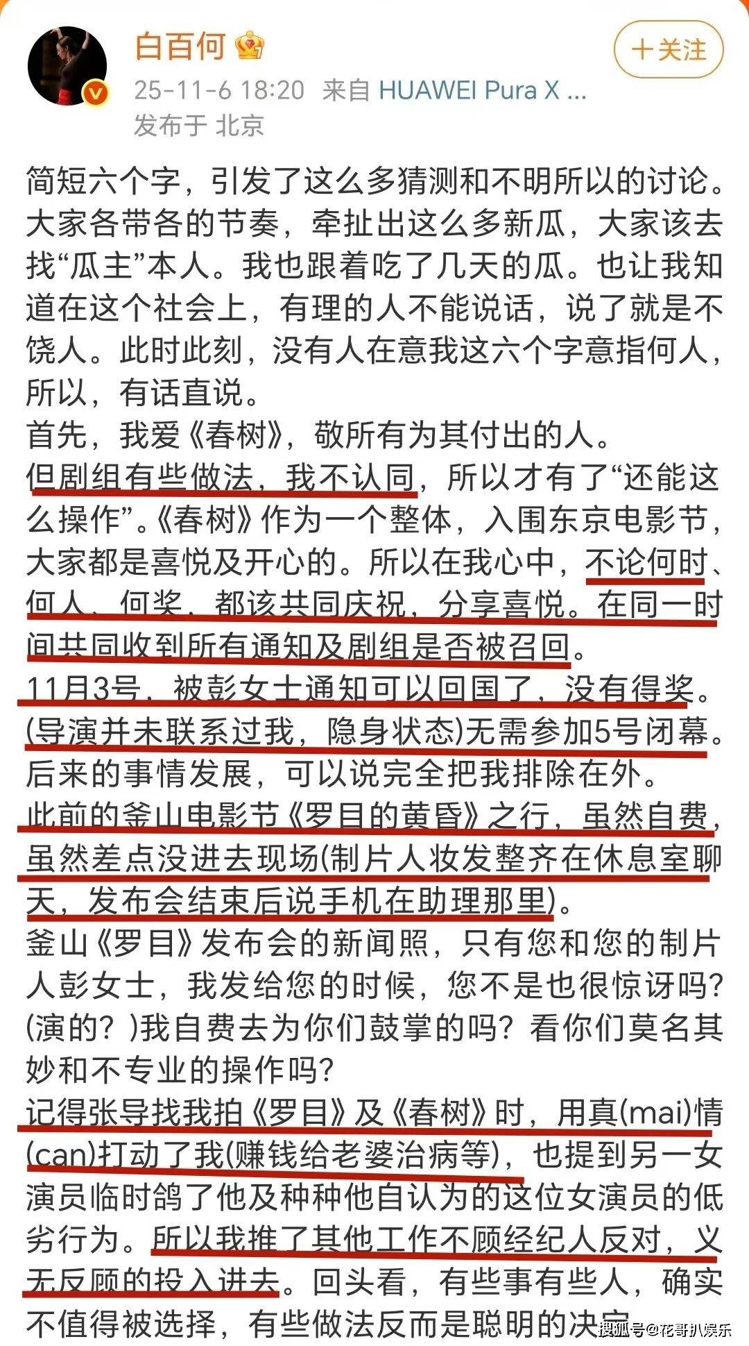 总结下来就是自己从始至终被剧组排挤,临时被制片人通知不许参加闭幕式,也不知道导演和男主会拿奖。制片人多次给她使绊子,之前她去釜山电影节都是自费,但差点连大门都进不去。导演张律当初一直卖惨,白百何才看在交情上,推掉其他工作去拍他的电影,结果却被背刺。