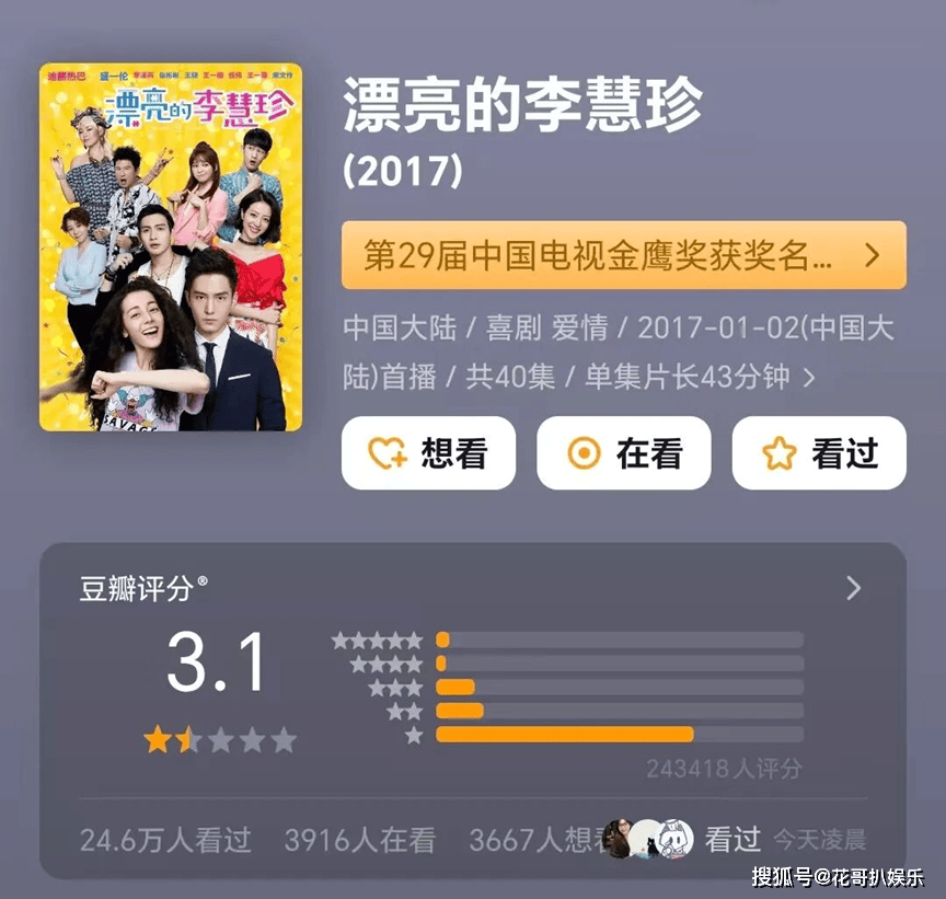当然了,这都不算什么,颁奖礼上最大的笑话还要数金鹰奖。那一年的迪丽热巴靠着豆瓣评分3.1的《漂亮的李慧珍》力压一众实力派女星荣获金鹰视后。