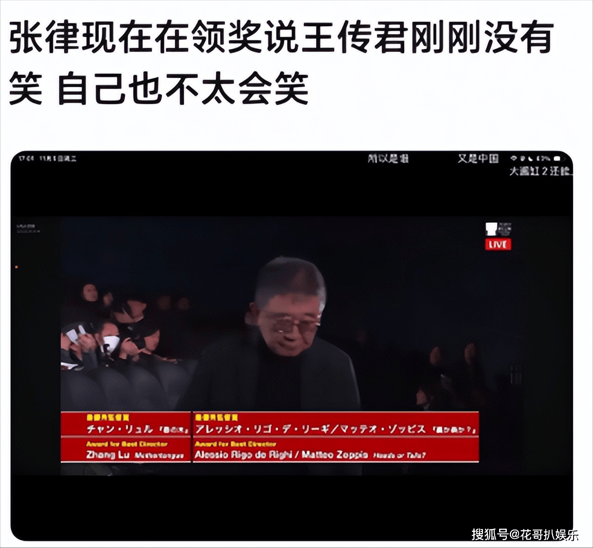 《春树》的导演张律也拿奖了,他却在发表获奖感言的时候cue到了王传君,说他刚才就没有笑,自己也不会笑。这番话说得就挺好笑的。