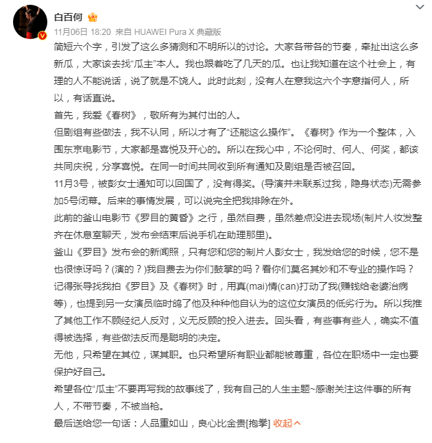 今日,著名女星白百何发文,回应对东京电影节争议,她控诉了《春树》剧组的职场不公行为,而非质疑奖项归属本身,引发热议!文章指出众多问题,大概归纳一下:11月3日,制片人彭瑾通知白百何
