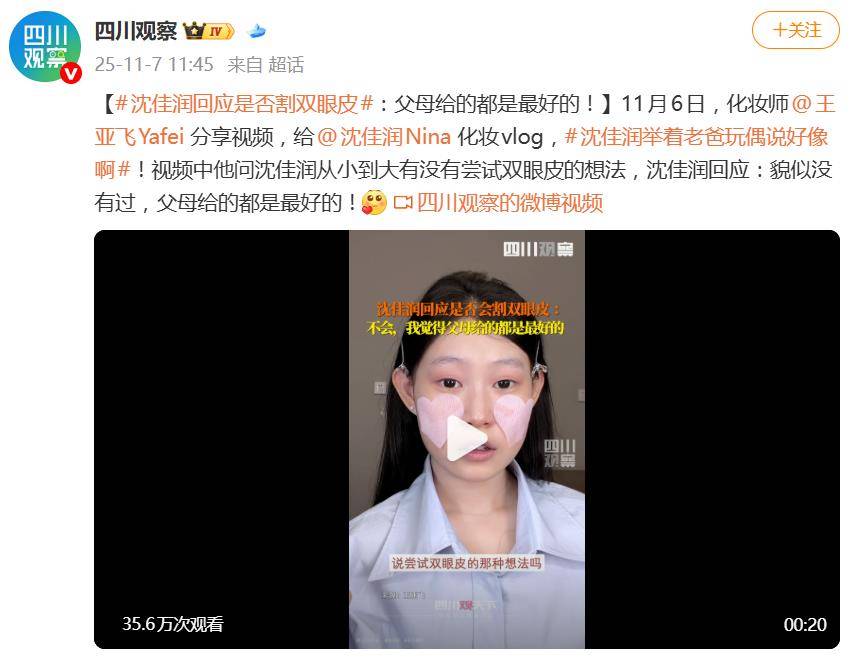 一句“父母给的都是最好的”,让沈佳润再次被推上热搜。据11月7日报道,在化妆师王亚飞2025年11月6日发布的化妆视频里,当被问及“从小到大有没有尝试割双眼皮的
