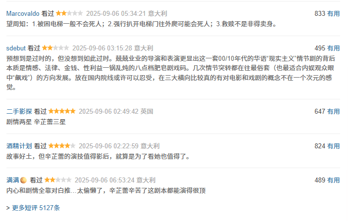 目前豆瓣首页上的五条热评,其实都是差评,其中有抱怨电影“预想到是过时的,但没想到如此过时”、“故事好土”、“内心和剧情全靠对白推,太偷懒了”。就连那条五星,也只给了剧情两星,另外三星给到辛芷蕾。