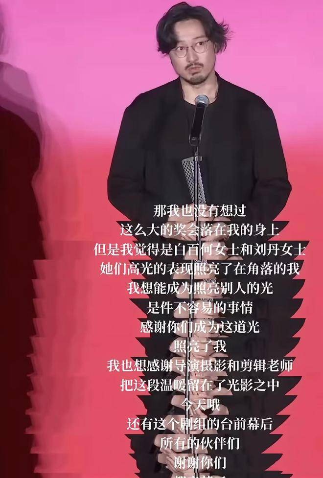 王传君这边,完全是被浪潮卷到礁石上的贝壳。颁奖前一周,他随《春树》做完最后一场映后,回酒店路上被制片叫住:“如果真有惊喜,准备一段发言,别丢份。”他以为“惊喜”是电影卖出版权,没料到是影帝。领奖那一刻,他大脑空白,先感谢白百合、刘丹,再感谢“角落里的自己”,被公关团队誉为“高情商模板”。可后台采访区,他盯着奖杯自言自语:“这真是我的吗?”视频被剪进去,成了“心虚证据”。