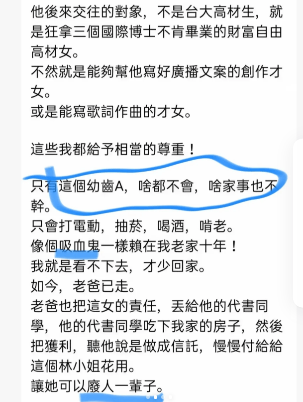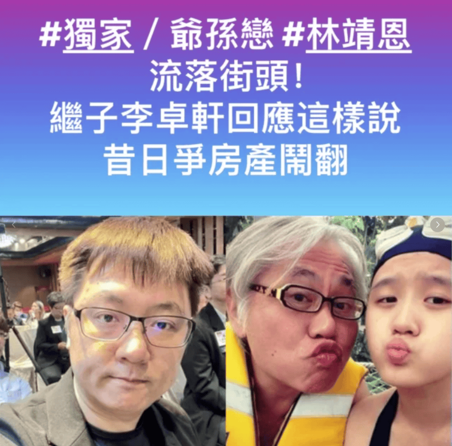 l李坤成的儿子李卓轩分割完财产之后发文,说她是爸爸交往过的最没用的对象,是吸血鬼,废人一辈子。 林靖恩去年流落街头,偷吃居民外卖,偷喝超市饮料,在公园里与流浪汉一起抽烟喝酒,李卓轩发文暗讽:欲食毋讨嫌,好额嘛会穷。